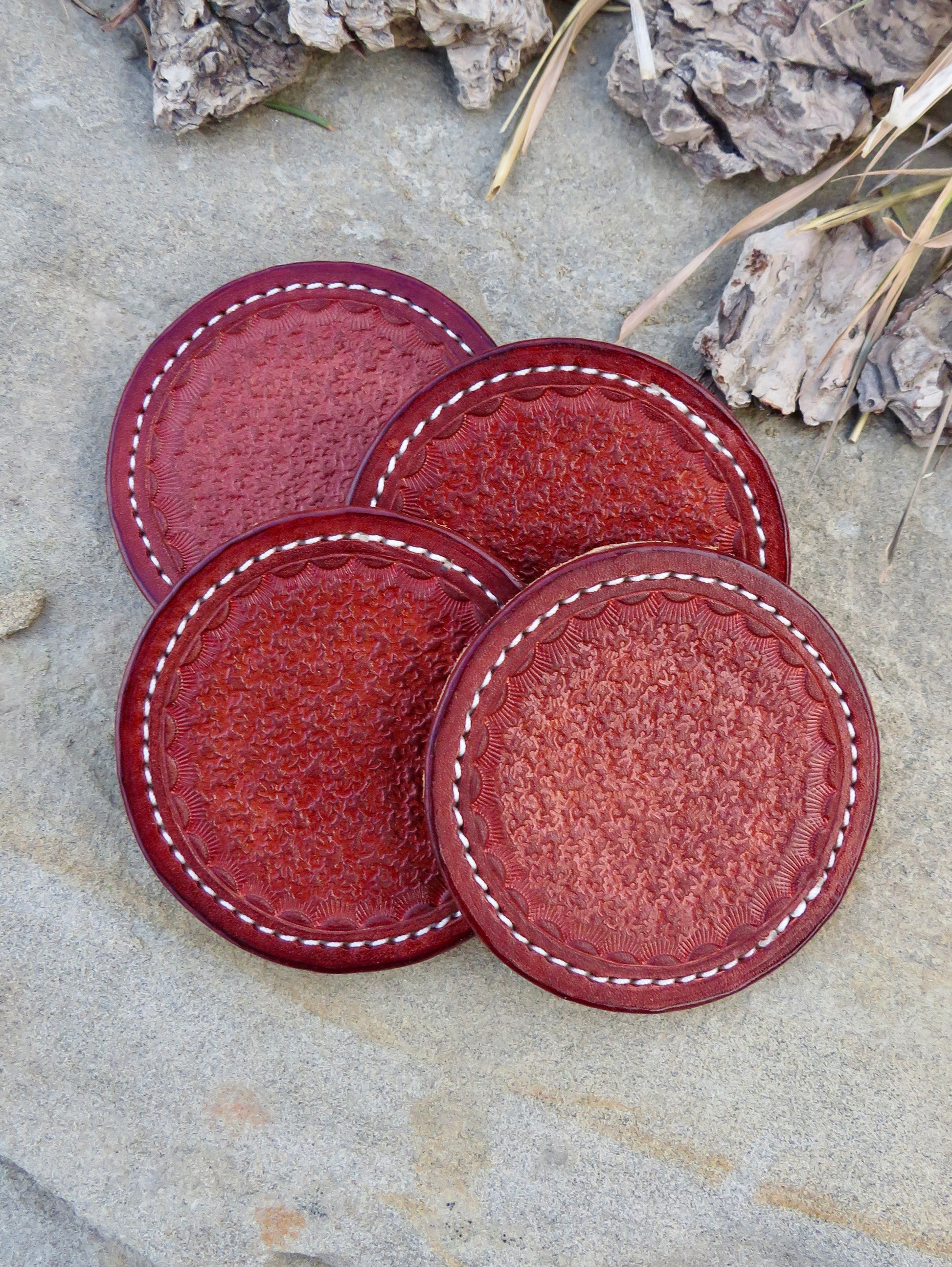 These genuine leather coaster sets are handmade in Wyoming. Each handcrafted set features 4 coasters with a textured design surrounded by a classic border. They have a cork board backing for extra stability and to provide a better skid-resistant surface. Each coaster is sealed with a flexible water-resistant coating. Collect multiples for a great gift, and to add that classy and rustic touch to your own home!